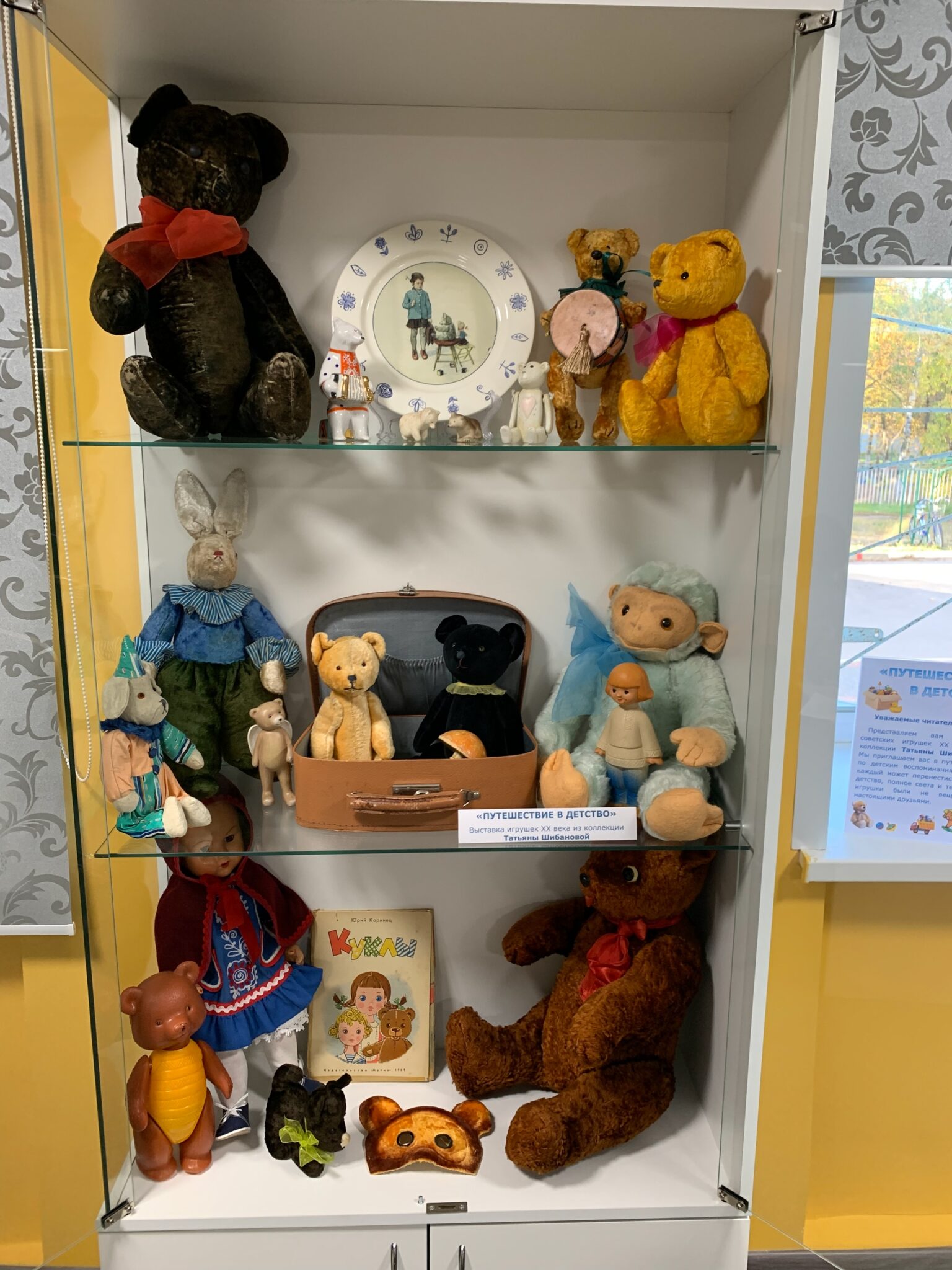 Выставка называется «Путешествие в детство»: на ней представлены игрушки ХХ века, те самые, в которые играли наши мамы и папы, бабушки и дедушки. Это плюшевые мишки разных размеров с подвижными лапами и головами, медведи из керамики и пластмассы, собачки, кукла, обезьяна, заяц, карнавальная маска, детская книжка и даже антикварный чемоданчик.