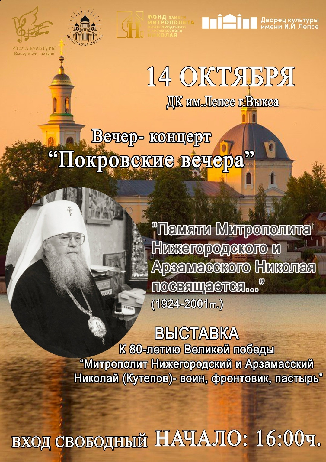 Вечер-концерт «Покровские вечера», посвященный памяти митрополита Нижегородского и Арзамасского Николая (Кутепова) состоится