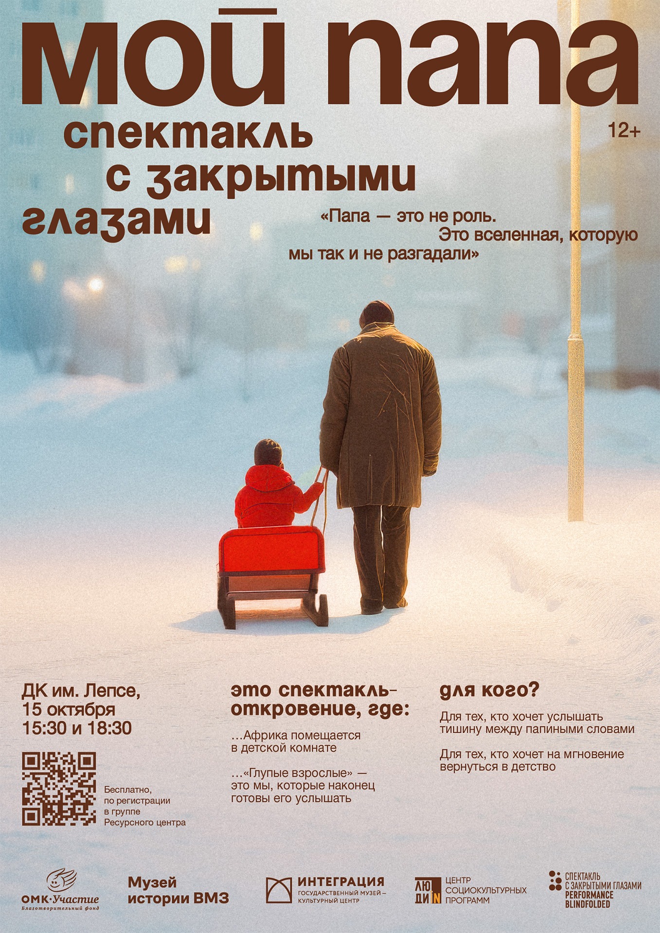 В Международный День белой трости во Дворце культуры имени И.И. Лепсе при поддержке благотворительного фонда «ОМК-Участие» и Ресурсного центра по социокультурной инклюзии пройдут два бесплатных сеанса спектакля с закрытыми глазами «Мой папа»