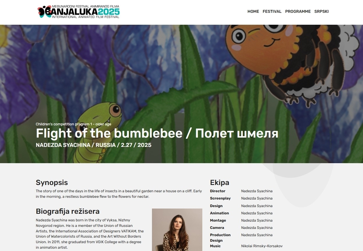 Кроме того, «Полёт шмеля» был представлен на XV Коломенском фестивале любительского кино «Место встречи». Торжественная церемония награждения победителей XV Кинофестиваля любительского кино «Место встречи» запланирована на 29 ноября 2025 года, и мы надеемся на победу.