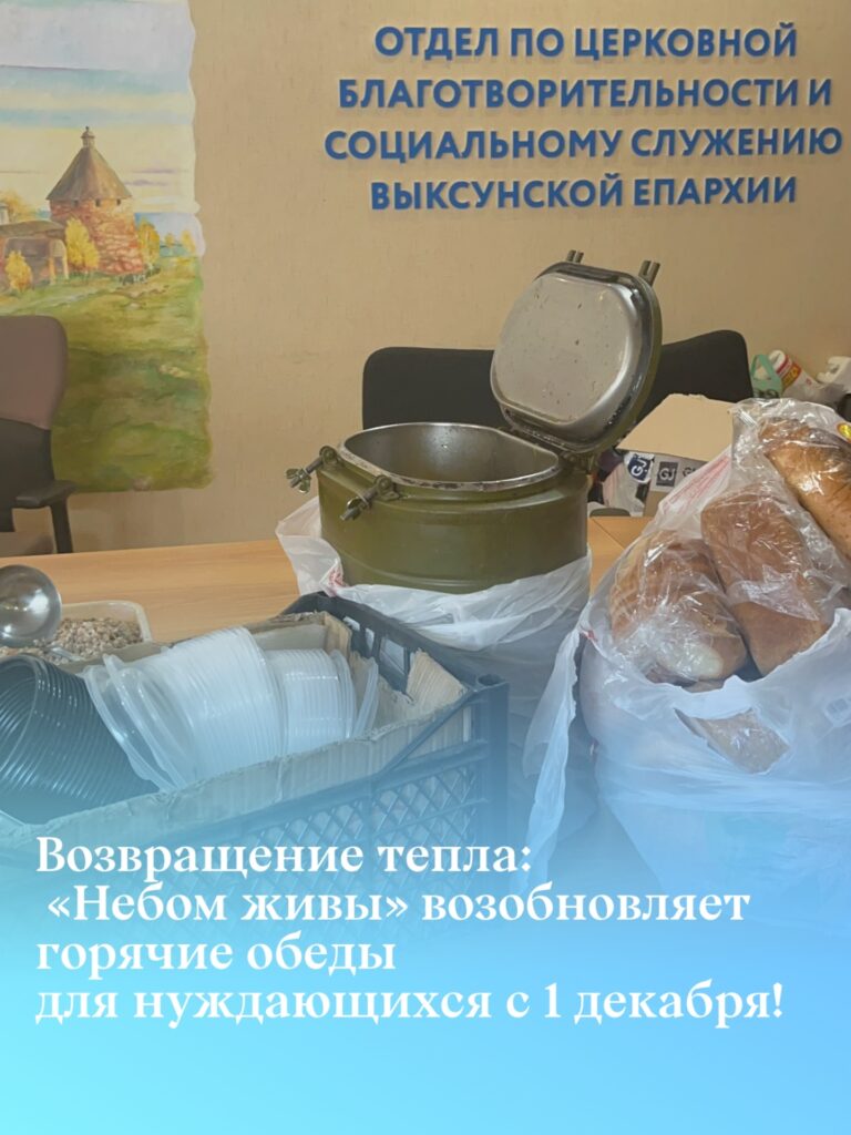 Социальный отдел Выксунской епархии в рамках проекта «Небом живы» с 1 декабря возобновил регулярное предоставление бесплатного горячего питания бездомным и нуждающимся, которым необходима поддержка, особенно в холодное время года.
