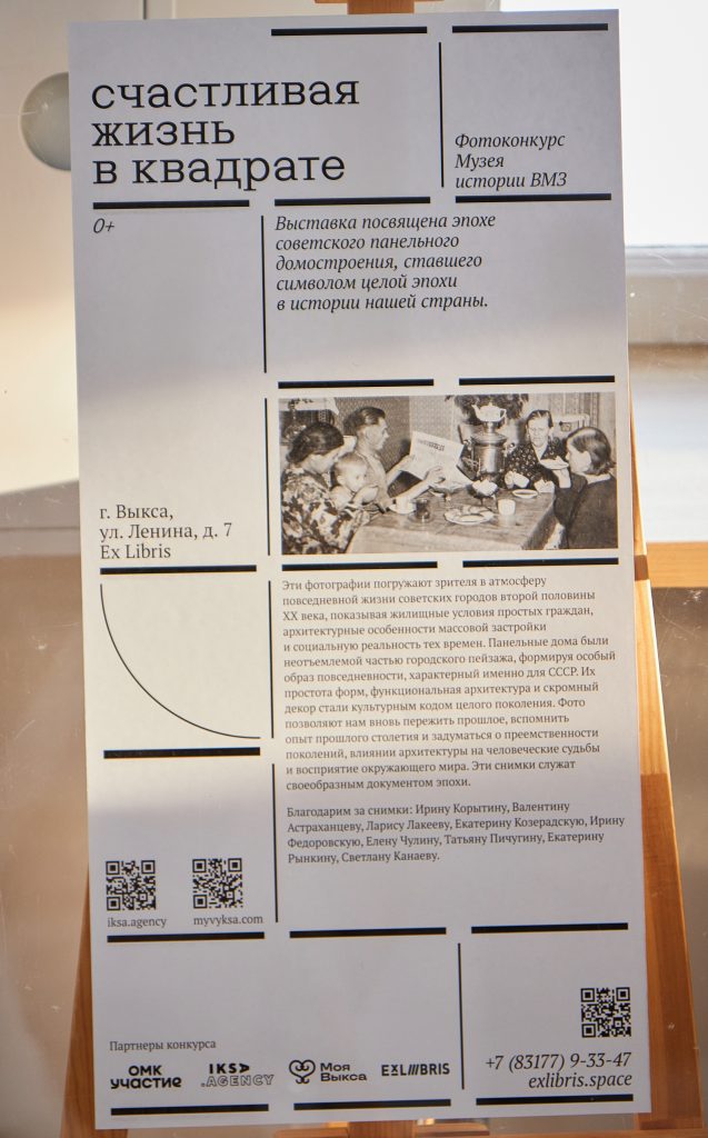 Фотовыставка «Квадратные метры счастья. Быт панельной эпохи» открыта в пространстве Ex Libris. Она является частью параллельной программы к выставке «Счастливая жизнь в квадрате. Выксунский эксперимент и индустриальное домостроение в СССР».